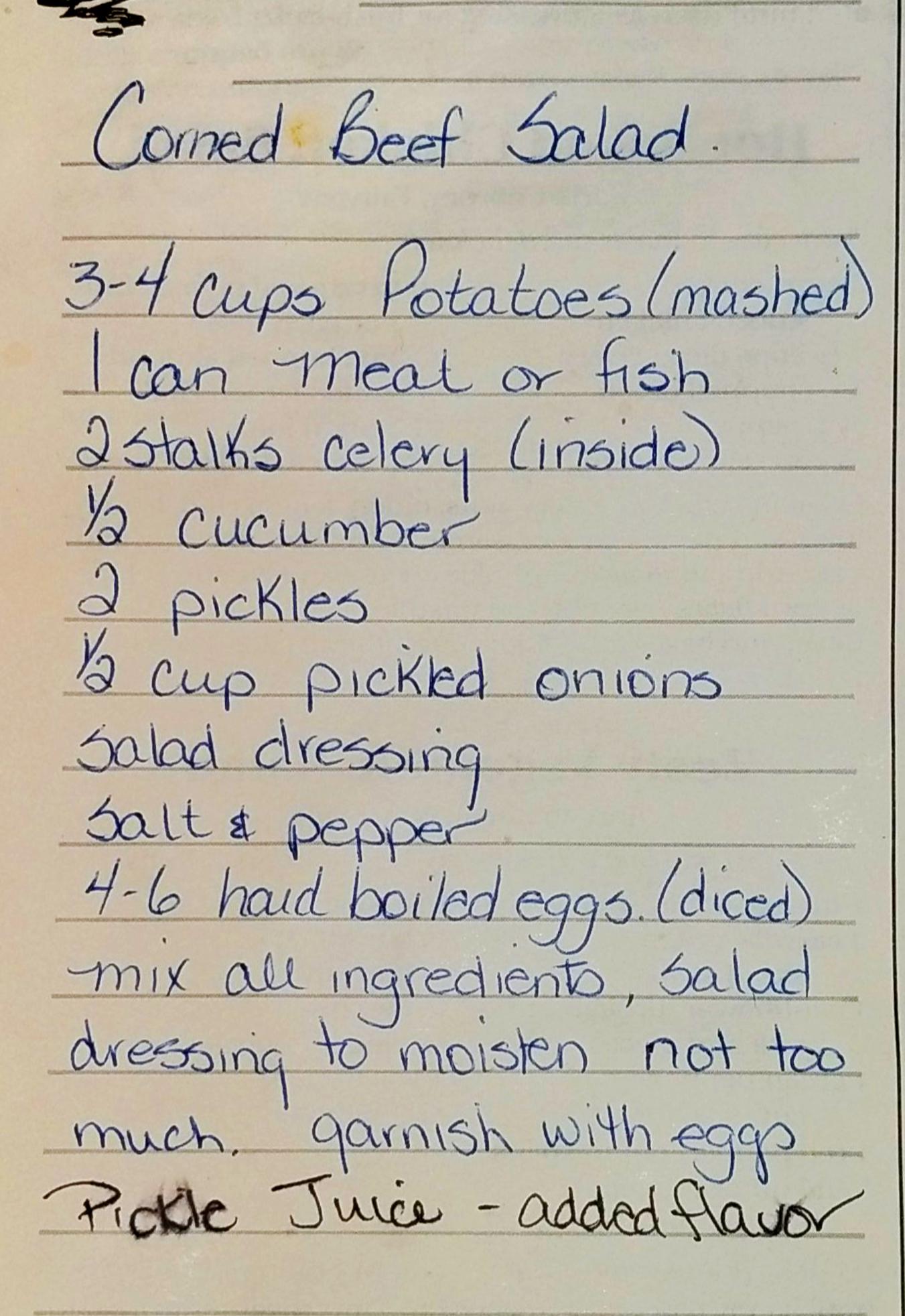 - Combine all diced ingredients, pickle juice, mashed potatoes, and corned beef in a large salad bowl
