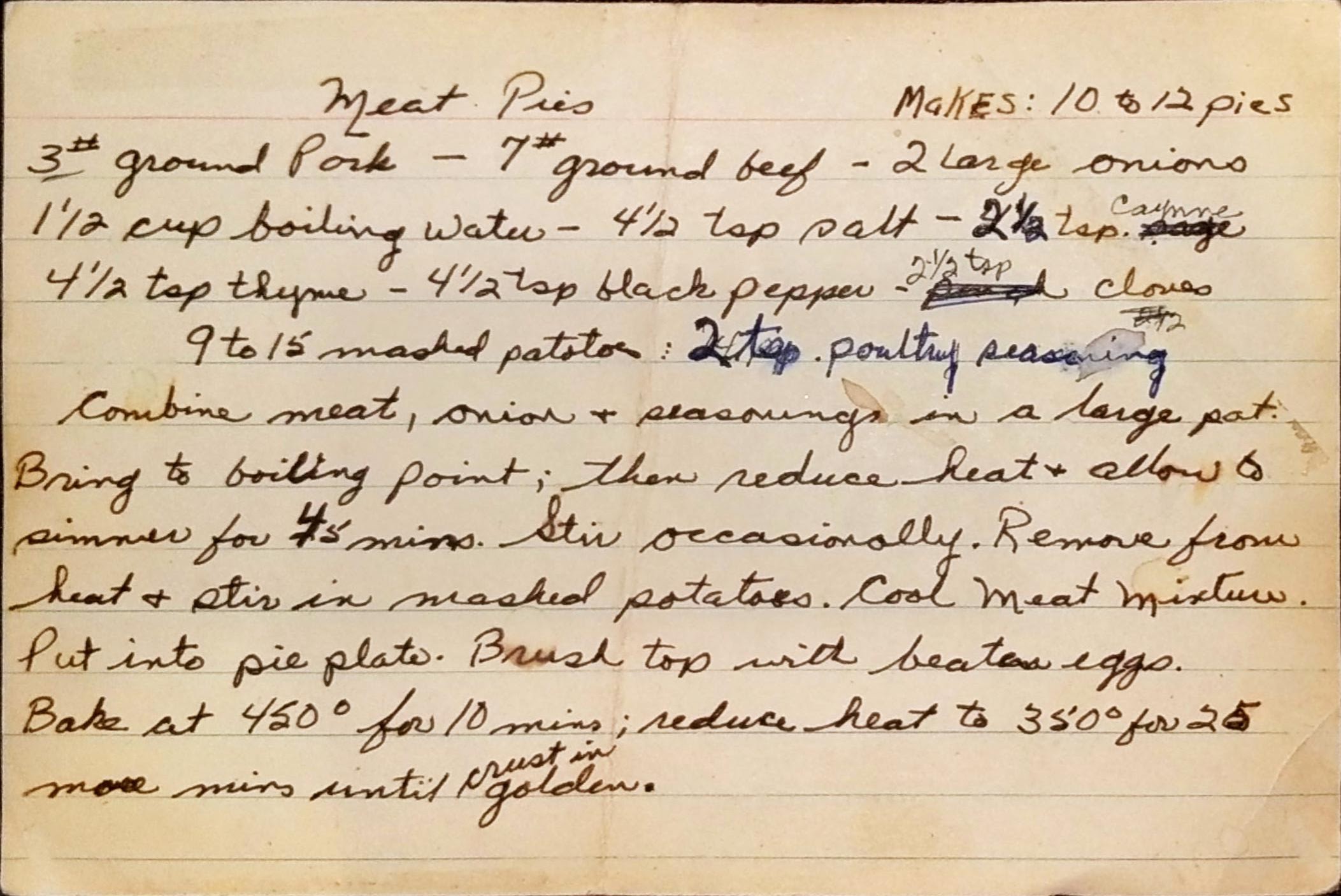 A traditional French-Canadian dish. Makes 10 to 12 pies. Look to Meat Pie I for a smaller batch.Ingredients